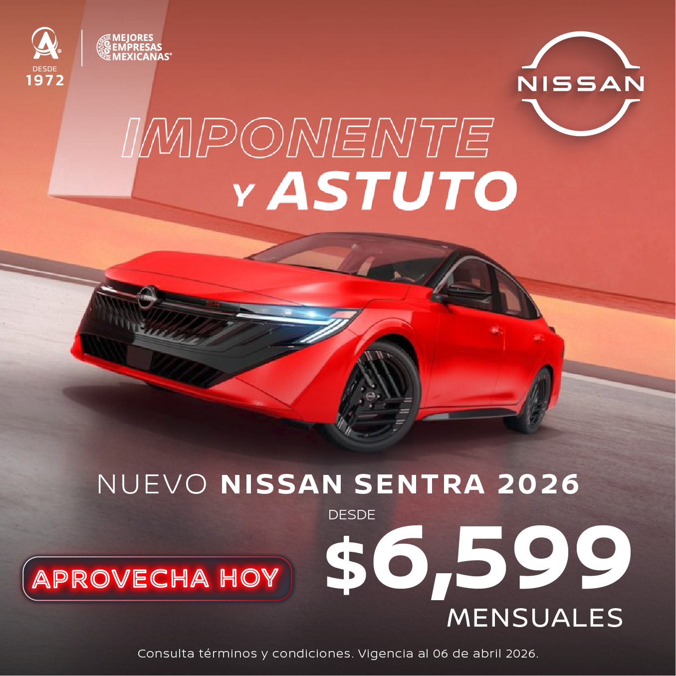 Aplica para SENTRA SENSE CVT ‘26 en operaciones de crédito con el plan Crédito Nissan con el 40% de enganche a un plazo de 60 meses. No aplica con otras promociones ni en compra de flotillas. Para conocer planes y modalidades de crédito, verificar precios, requisitos de contratación, comisiones, disponibilidad, términos y condiciones, consulta a tu Distribuidor Autorizado Nissan. Vigencia al 6 de abril de 2026.